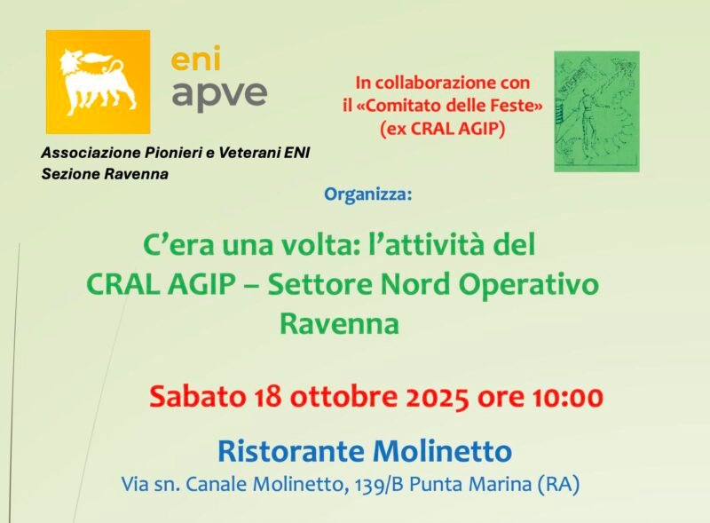 La Sezione APVE di Ravenna, in collaborazione con il Comitato Feste (ex CRAL AGIP), organizza sabato 18 ottobre 2025 un ritrovo degli iscritti del CRAL Aziendale AGIP di Ravenna.